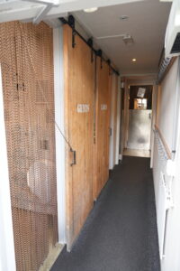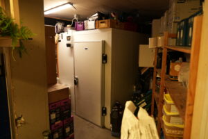 De deur rechts van de overkapping geeft toegang tot de overige overdekte opslagruimtes. Hier bevinden zich de koelcel, vriezers, opslag voor alle voorraden, de afvalcontainers en een aparte ruimte voor personeel om zich om te kleden. Voor extra opslag is er ook ruimte in de kelder, waar zich tevens twee grote biertanks bevinden.