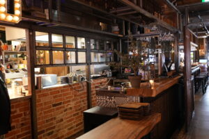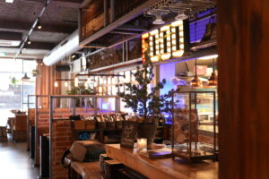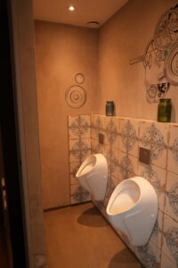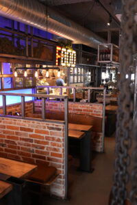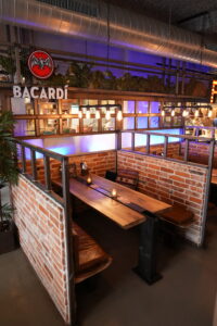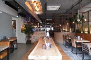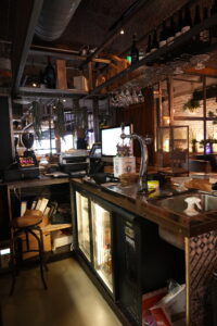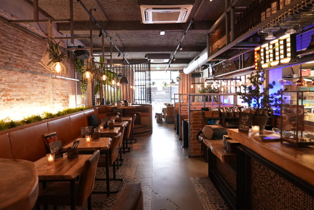 Het houten blad in combinatie met sierlijke tegels zorgt voor een authentieke, warme uitstraling. Tegelijkertijd creëren de stalen balken, metalen rekken en industriële barkrukken een stoere, urban vibe. Deze stijl is consequent doorgevoerd in het hele restaurant, waarbij het interieur perfect aansluit op het totale concept. Alles klopt tot in detail en vormt samen een onderscheidende totaalbeleving voor de ca. 140 gasten die binnen kunnen plaatsnemen.