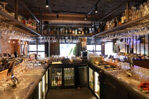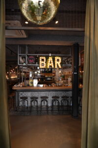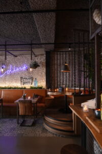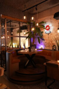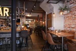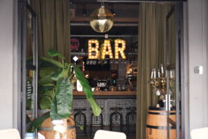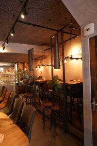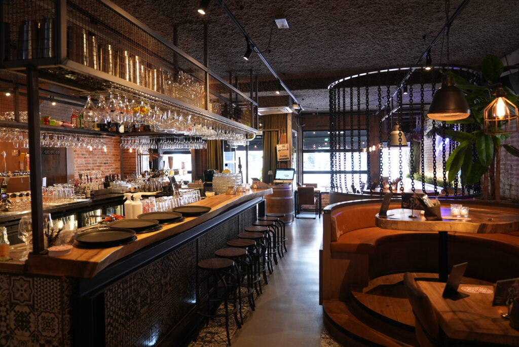 Het pand ademt dus een warme, huiselijke sfeer. Verspreid door het hele restaurant bevinden zich diverse zithoeken, wat zorgt voor een intieme en gezellige ambiance die de huiselijke uitstraling versterkt. Gasten worden bij binnenkomst verwelkomd door de indrukwekkende, grote rechthoekige bar die centraal in het voorste gedeelte van het restaurant staat.