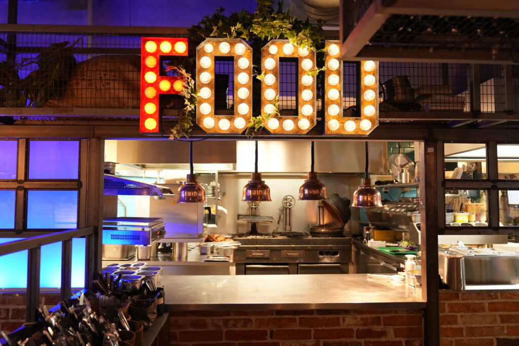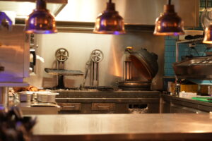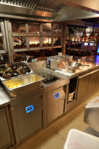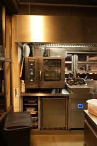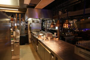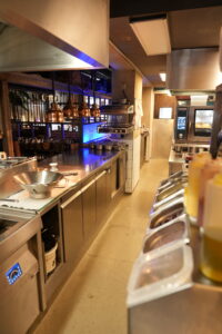 De open keuken bevindt zich aan de rechterzijde, centraal in het restaurant, en is voorzien van uitsluitend professioneel en hoogwaardige apparatuur. De drie grote ingebouwde BBQ’s met speciale afzuiginstallatie vormen het kloppende hart van de keuken. Dankzij de efficiënte indeling beschikt de keuken over meerdere secties: een overzichtelijke passe, aparte werkplekken voor voor-, hoofd- en nagerechten, én een aparte spoelkeuken. De centrale ligging maakt het voor het bedienend personeel eenvoudig om zowel het voorste als het achterste deel van het restaurant, alsook de terrassen, snel en efficiënt te bedienen.