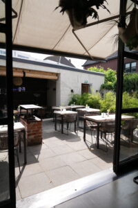 Rechts achterin zijn de toiletgroepen gesitueerd en de achterdeur naar het terras. De glazen achterpui kan vrijwel volledig geopend worden, waardoor een soepele overgang ontstaat tussen binnen en buiten. Hier kunnen ca. 22 gasten plaatsnemen rondom de ingebouwde open haard, terwijl onder de overkapping achter in de tuin nog ruimte is voor ongeveer 12 à 14 personen.